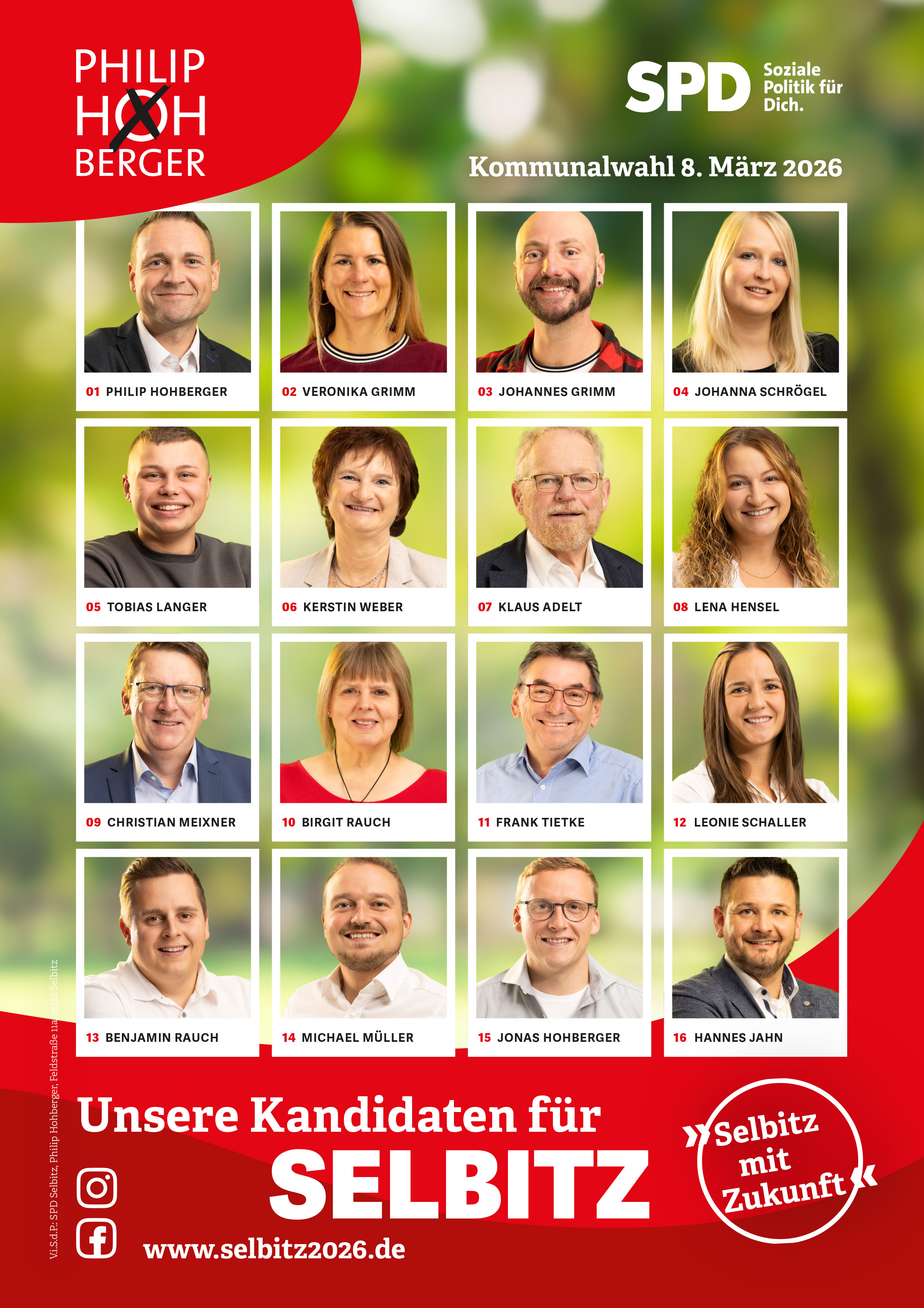 Als neuer Bürgermeister verspreche ich Ihnen Kommunikationsstärke, strategisches Denken und das Ziel, unser Selbitz fit für die Zukunft zu machen. Ich bin mit 33 Jahren jung und erfahren zugleich. Wir haben bei der SPD Selbitz viele engagierte Menschen auf unserer neuen Liste und einen erfahrenen Altbürgermeister im Team.